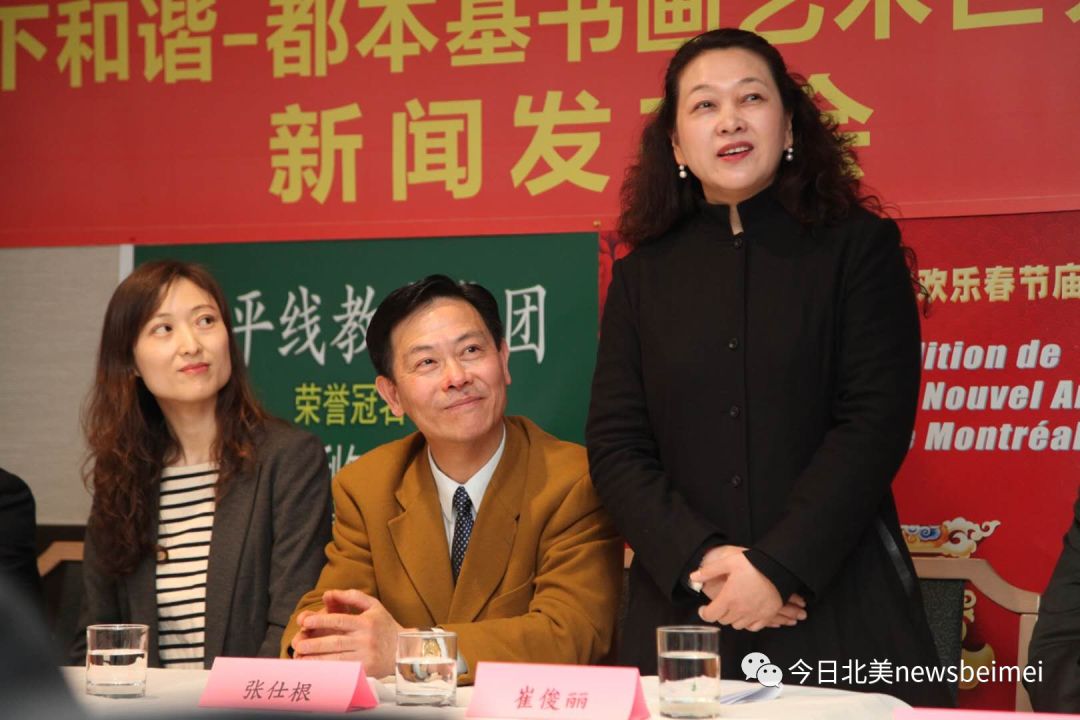 中华人民共和国驻蒙特利尔总领馆梁宵领事、梁荩文副领事出席了新闻发布会。“第二届蒙特利尔欢乐春节庙会”筹委会主席张仕根主持会议,“天下和谐-都本基书画艺术世界巡展”组委会主席崔俊丽主席崔俊丽和秘书长颜宪智莅临现场展示了部分大师书画作品。